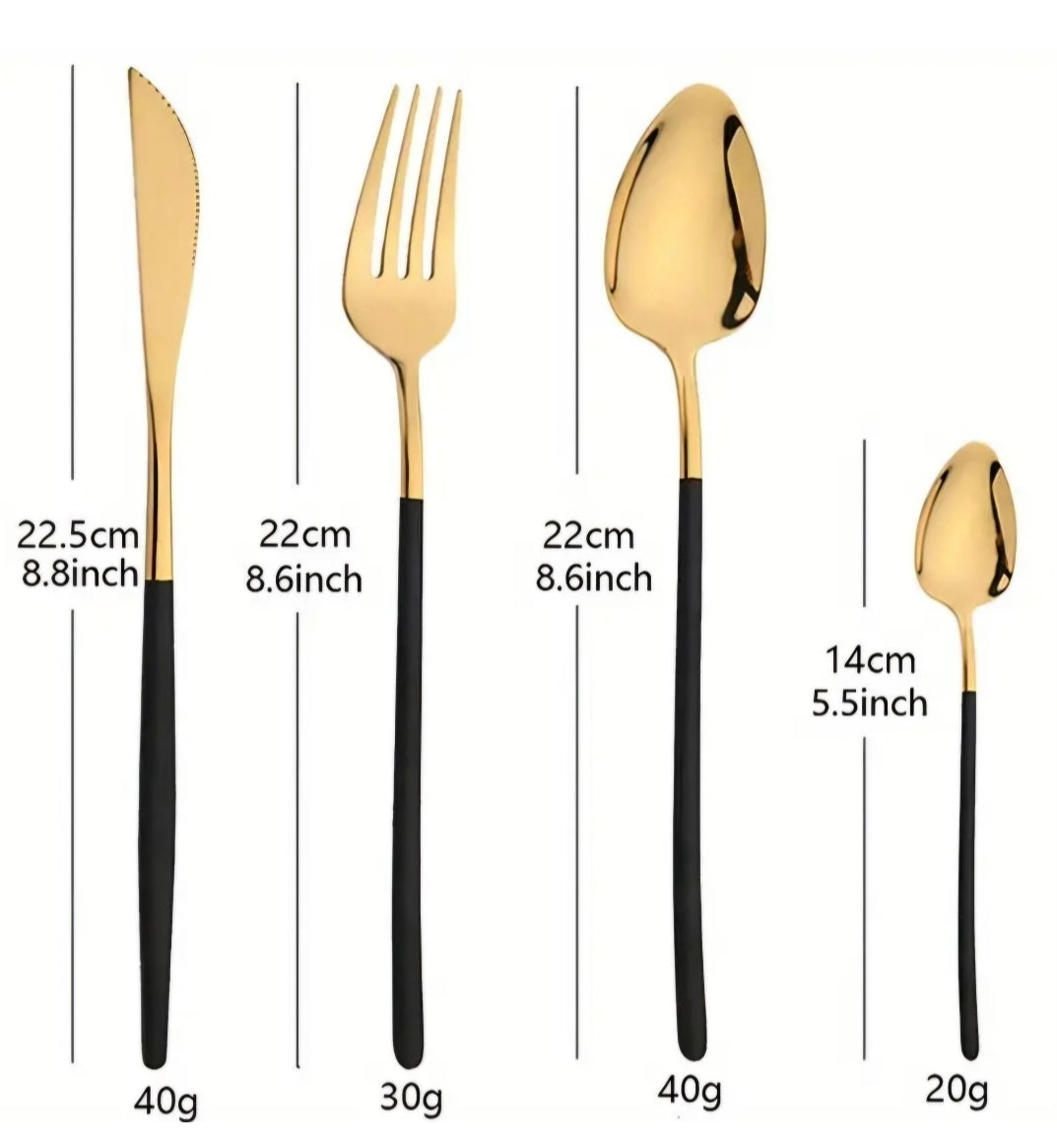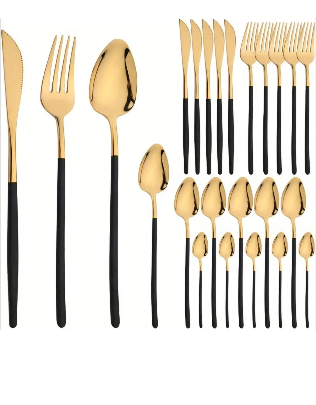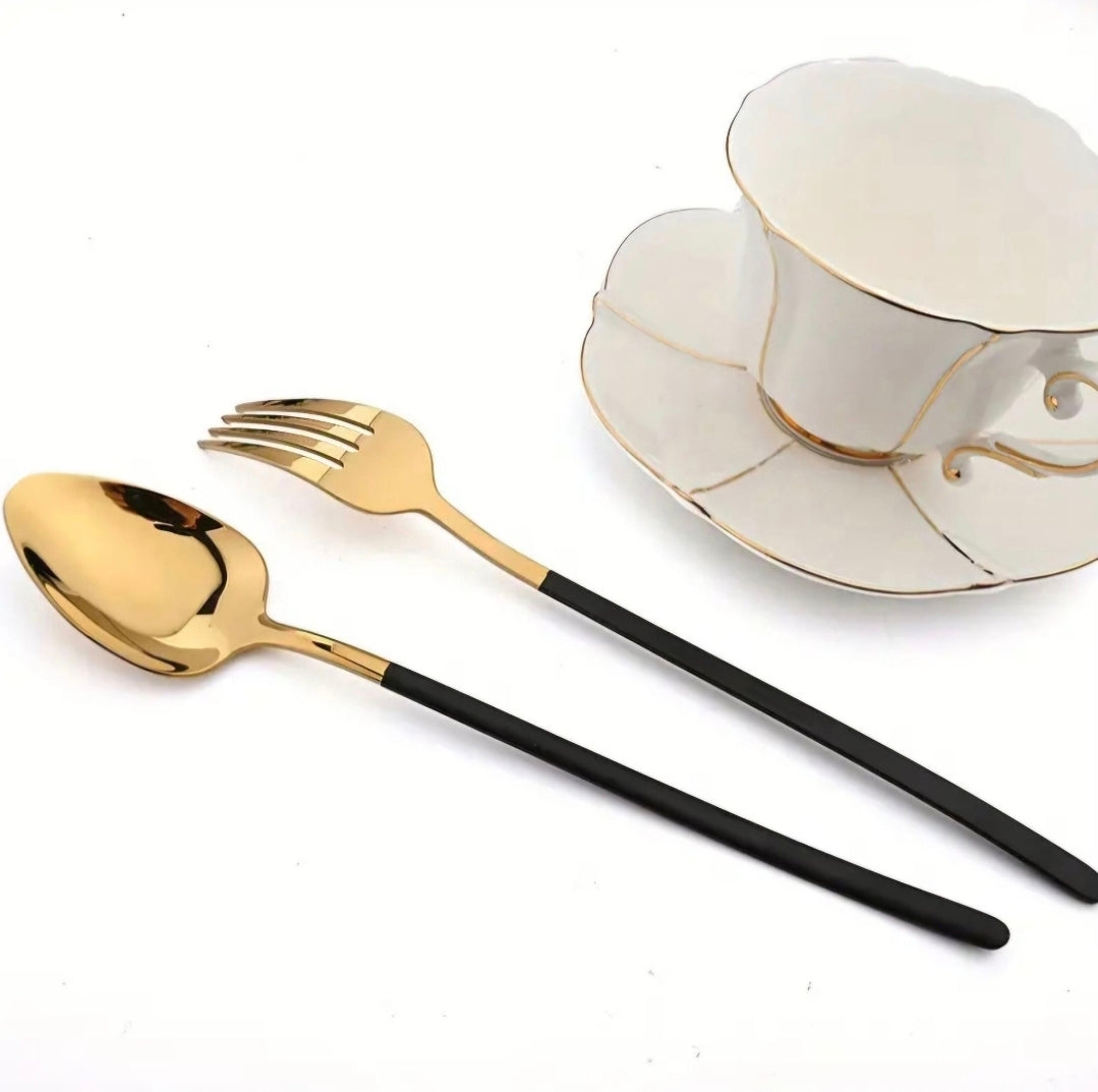Ett elegant bestickset i guld med svarta handtag. Perfekt för att duka bordet med stil.