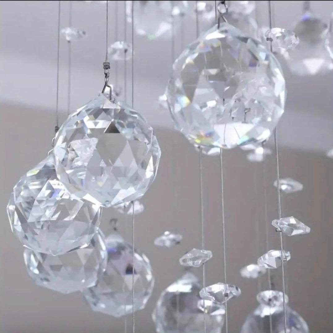 Lampan har en rund kromad bas med en diameter på 20 cm och en fallhöjd på 40 cm. Kristallerna hänger i olika längder vilket ger ett dynamiskt och exklusivt intryck – som ett konstverk i taket. Passar både modern och klassisk inredning.