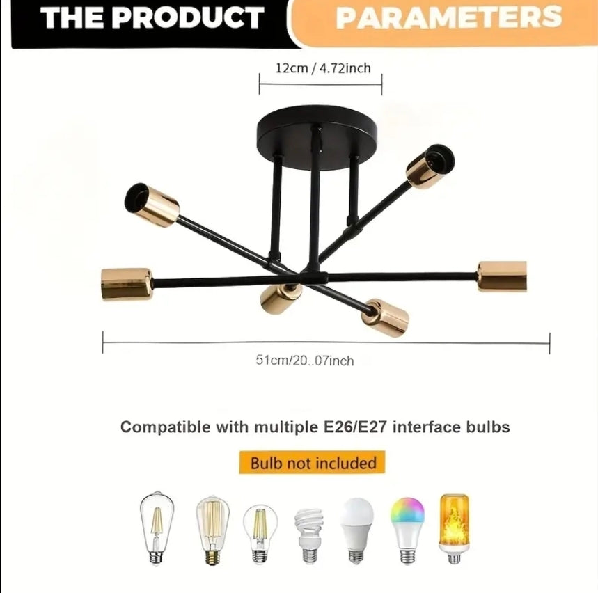 Ge rummet en stilren uppgradering med denna moderna taklampa i svart finish. Med plats för sex E27-ljuskällor (max 60W) får du både funktionell och dekorativ belysning – perfekt för vardagsrum, sovrum, kök eller hall.